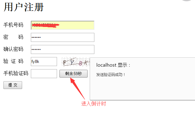 好了,我们来走一遍注册的流程: 1.填好注册信息后,发送短信验证码,并成功接收到。